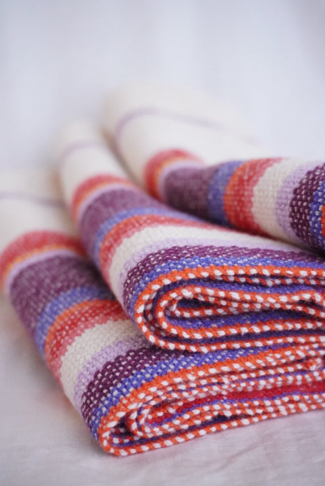 Towels are woven in plain weave with 6/2 cotton. Cloth will soften and gain absorbency with repeated use and washing. These towels will brighten any space and are truly wonderful to use.