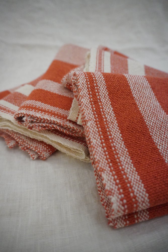 Towels are woven in plain weave with 6/2 cotton. Cloth will soften and gain absorbency with repeated use and washing. These towels will brighten any space and are truly wonderful to use.